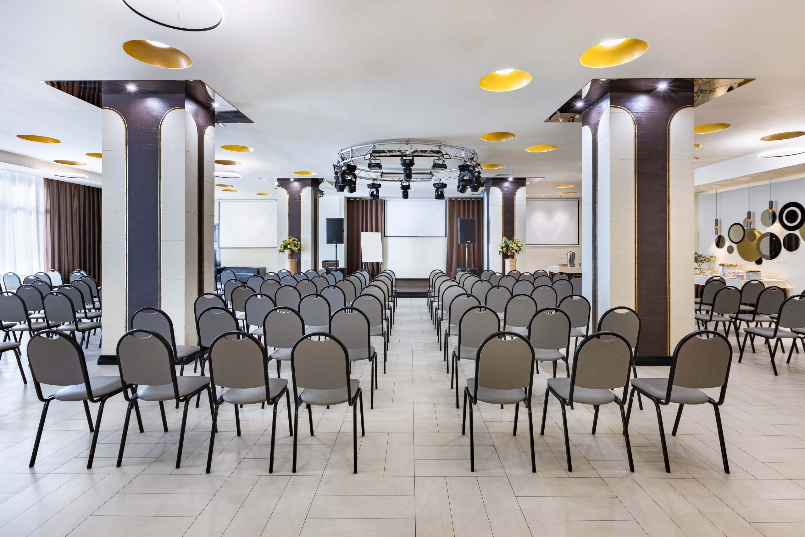 Элегантный зал «Модерн» идеально подходит для проведения торжественных и деловых мероприятий большого масштаба.