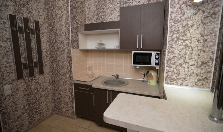 В номере: Гостиная, совмещенная с прихожей и мини-кухней: раскладной диван, журнальный столик, ЖК телевизор, 2 стула, шкаф-купе, вешалка для верхней одежды.